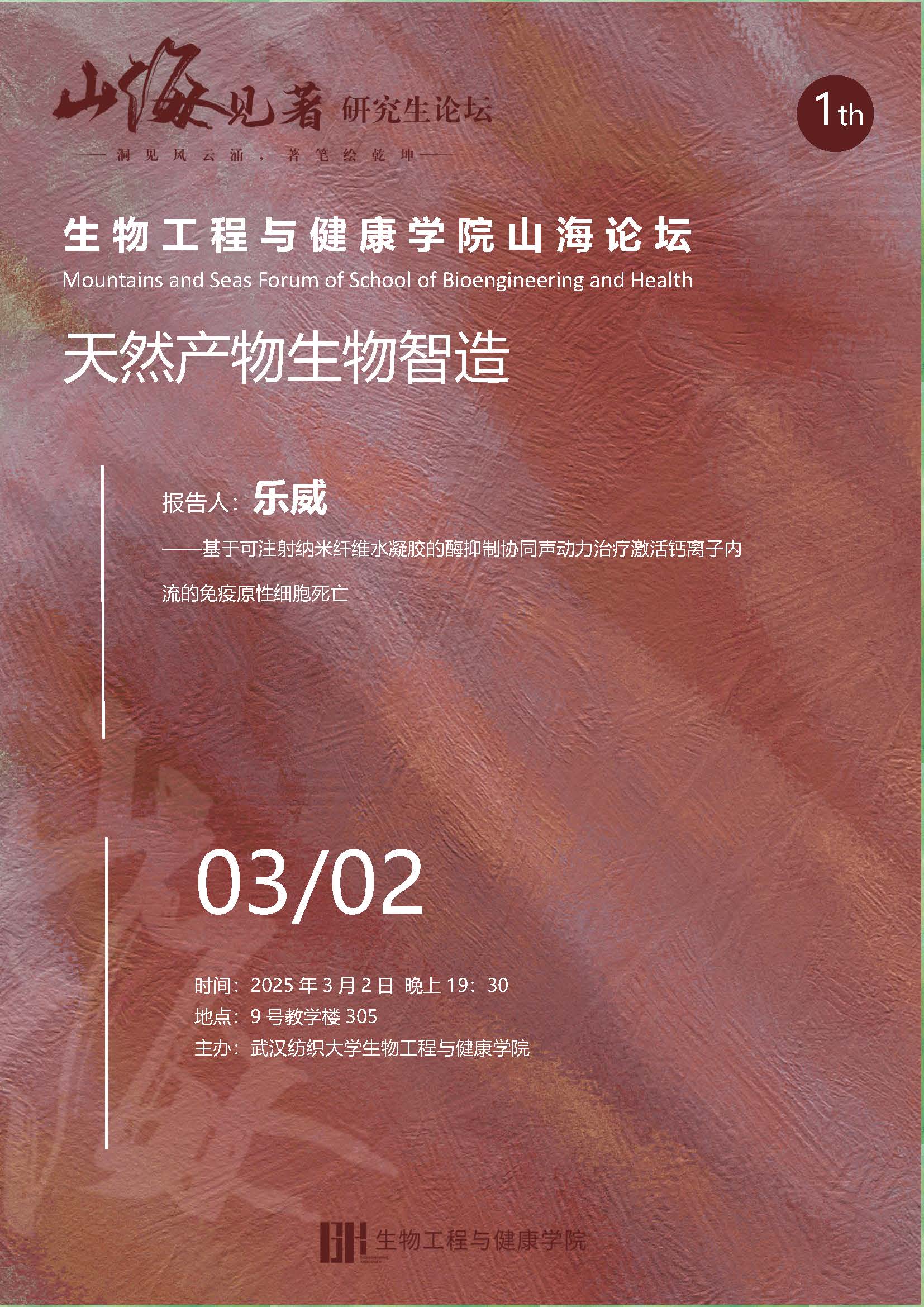 3月2日,武汉纺织大学生物工程与健康学院主办的“山海论坛”在学校9号教学楼305教室举行。本次论坛主题为“天然产物生物智造”,由乐威同学带来题为《基于可注射纳米纤维水凝胶的酶抑制协同声动力治疗激活钙离子内流的免疫原性细胞死亡》的学术报告。