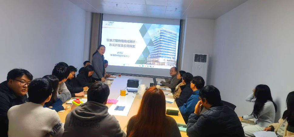 随后,武博士进行了一场严谨又接地气的学术报告。首先,他为在座师生科普了甘油三酯作为膳食油脂的核心成分,其精细结构的解析对食品科学、临床营养及生物医药研究具有重要意义。随后,其团队基于先进质谱技术,构建了高效精准的甘油三酯解析方法,突破了传统油脂品质控制的局限。该方法在药用辅料质量控制、功能性结构酯分析及生物医学研究等领域展现出广阔应用前景,为食品科学及相关交叉学科研究提供新思路。